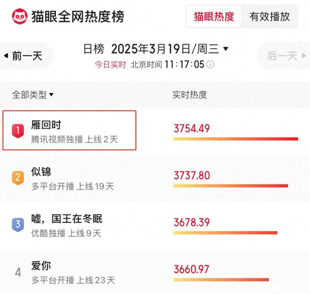 | 当下的国产剧市场,竞争激烈。《仁心俱乐部》、《似锦》、《嘘,国王在冬眠》等剧播的热火朝天,让观众纠结不知看哪部好。 正在这时,一部空降剧却吸引了观众的注意,那就是鹅厂播出的《雁回时》,一开播就牢牢占据全网热度第一,收视不容小觑。